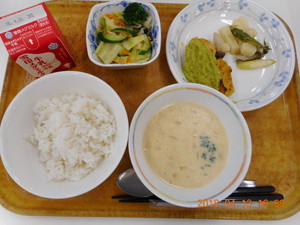 ごはん タンドリーチキン 芋とアスパラのソテー じゃこナッツサラダ コーンポタージュ |