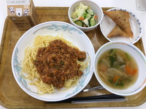 ミートソーススパゲティ ツナサモサ コールスロー きのことかぶのスープ コーヒー牛乳 |