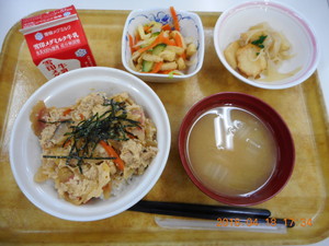 親子丼 リヨネーズポテト 和風サラダ みそ汁 |