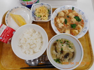 ごはん マーボー豆腐 バンサンスー 中華風きのこスープ 果物 |