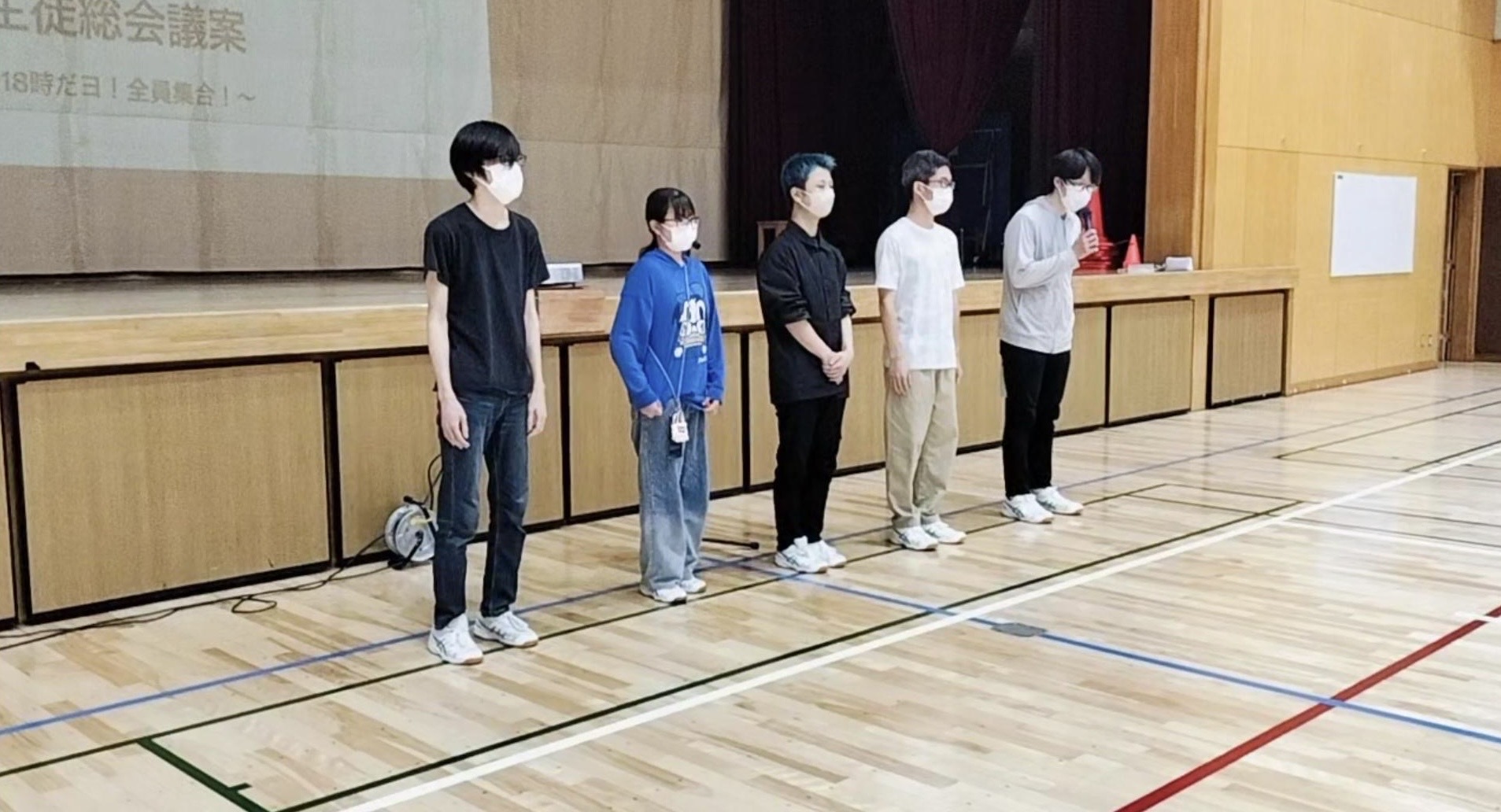 生徒総会では一斉委員会、各部活で決めていた目標や昨年の活動内容を報告し合ったり、生徒会の決算報告、予算案を提示し、生徒の皆さんに承認していただきました。