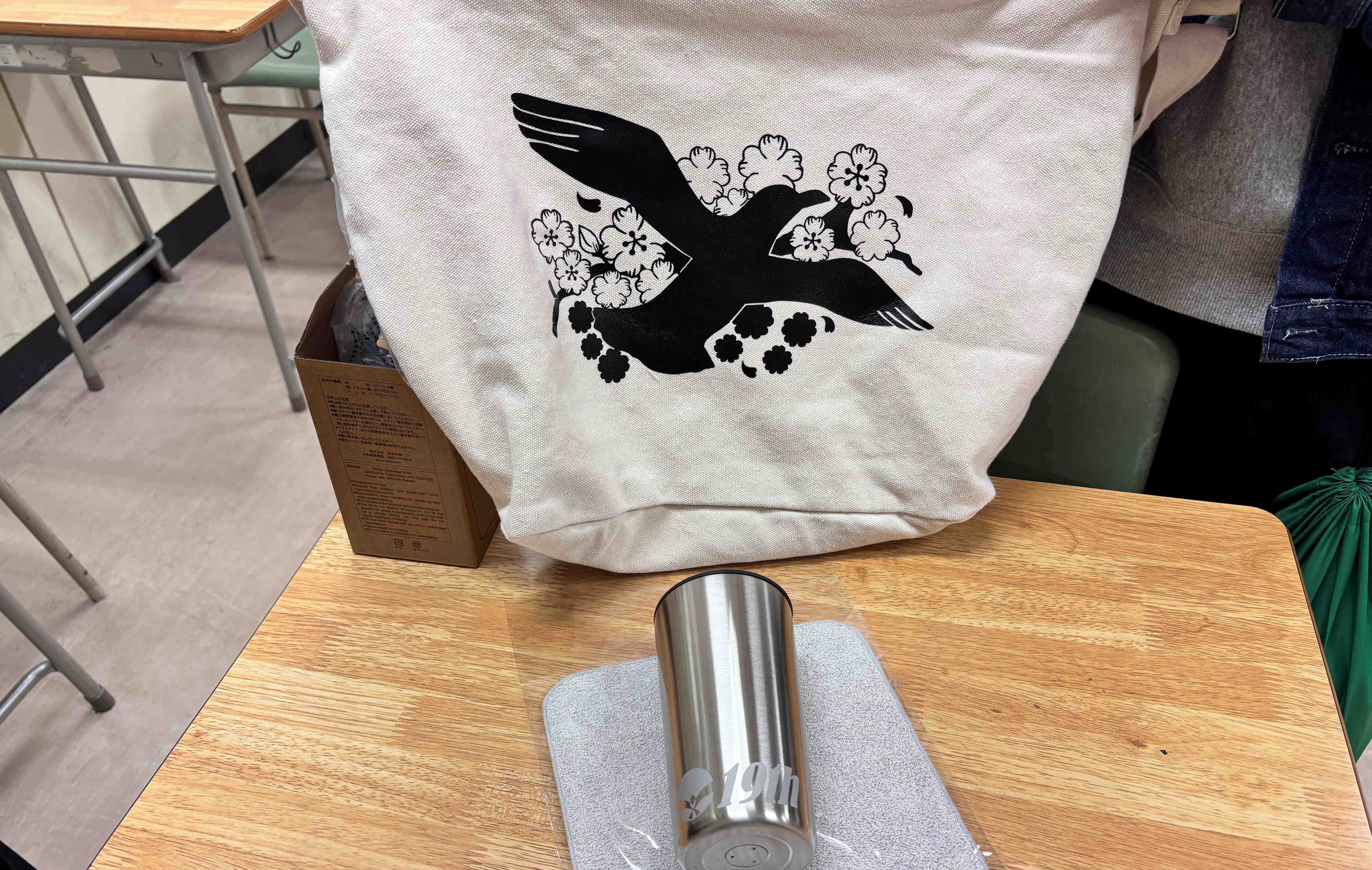 最後に卒業記念品として、オリジナルデザインのトートバッグとステンレスタンブラーを贈呈しました。