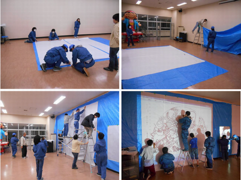 ・つなぎ合わせた和紙を壁に貼り付け、題材になる絵をプロジェクターで投影し、