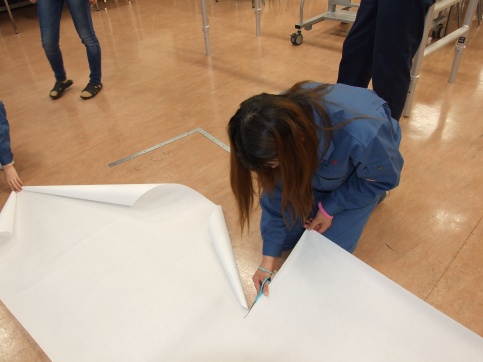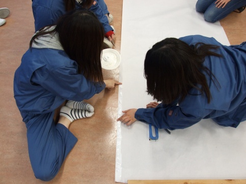 初めは、幅950㎜の和紙を4mほどに切り、4枚を貼り合わせてキャンバスを作ります。