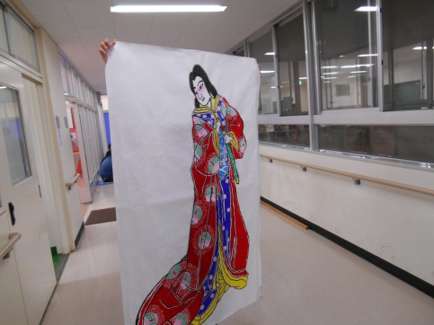 ろう書きまで終わった絵に染料で色を入れていきます。