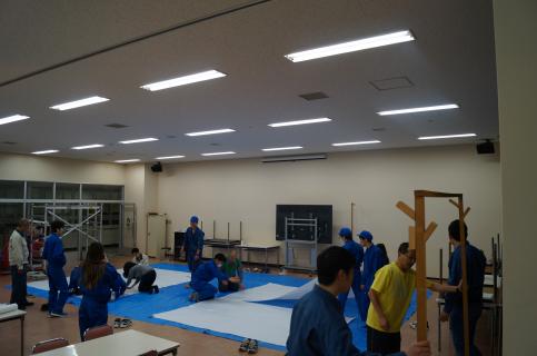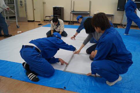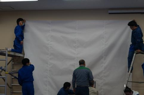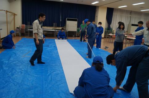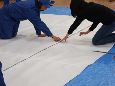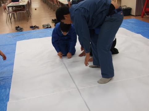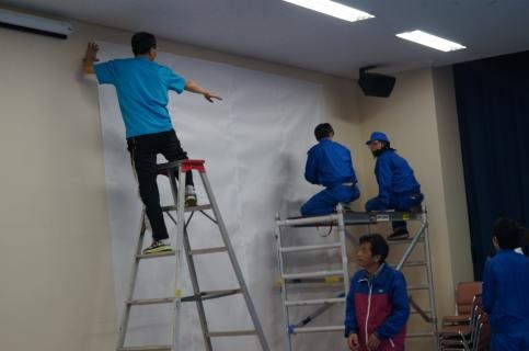 前回に引き続いて紙貼りを行い、完成したねぷたを描くキャンバスである約3m×約4mの紙を壁に貼り付けました。