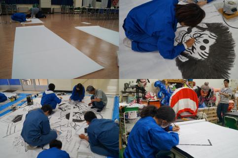 ねぶた絵の制作も佳境に近づき、技術指導をしていただいている小野先生(写真左上)の指導も力が入っています!