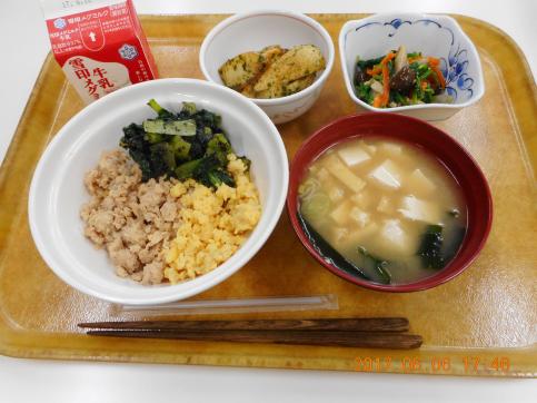 本日の三色丼の三色は、鶏そぼろ・炒り卵・小松菜です。