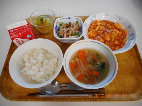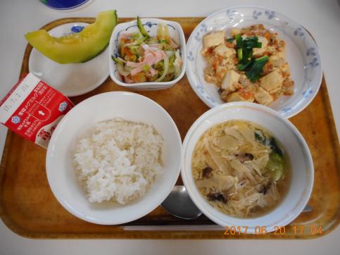 【献立】ごはん マーボー豆腐 中華サラダ 青梗菜の卵スープ メロン