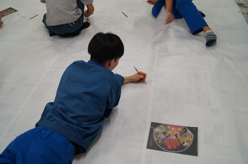 今度は床において、下書きや見本を見ながら鉛筆下書きの修正をします。