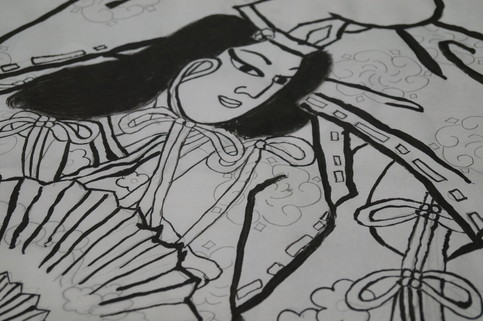 美人画の方は墨入れが終わり、袖絵に取り掛かっています。