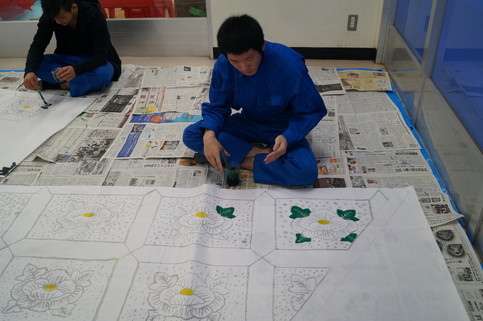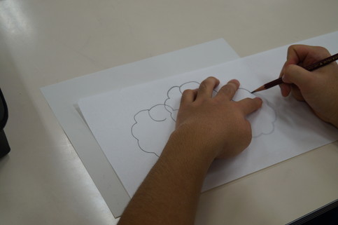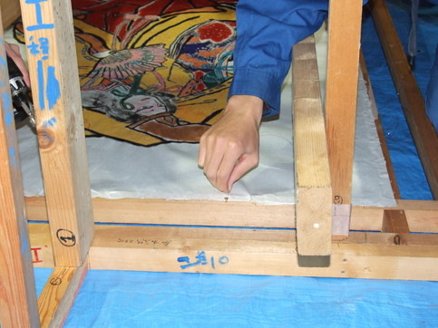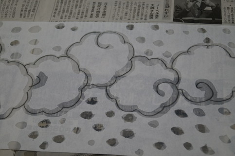 今回は雲の続きをやるとともに、以前完成させた牡丹の絵を開きの部分に貼る作業をしました。
