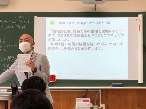 授業のテーマは「情報化社会の光と影」で、生徒たちと一緒に情報化社会の危険性について考えました。