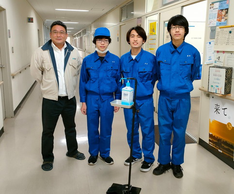 生産工学科3学年の選択科目の実習βにおいて、金属加工をして消毒台を作成し、職員室前に設置しました。