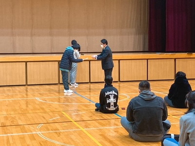 本校体育館にて各種表彰及び修了式を行い、各分掌主任から春休みに向けてのお話がありました。