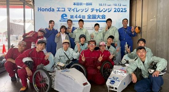 「本田宗一郎杯 Honda エコマイレッジチャレンジ 全国大会」への参加を、2023年から再開しています。コロナ禍による大会中止や参加見送りで大会経験者がいなくなってしまったところから、部員の奮闘、OBの協力により、2023年は3年生チームが122.360km/lという記録で完走しました。翌年は残念ながら、完走できずリタイアという結果になってしまいました。それから、マシンに改良を加え、今年度(2025年)は1年生チームは385.790km/lで15位、3年生チームは176.508km/lで25位という結果で、二台とも完走することができ、記録を大幅に更新することができました。2026年度は450km/lを目指して頑張っていきます。