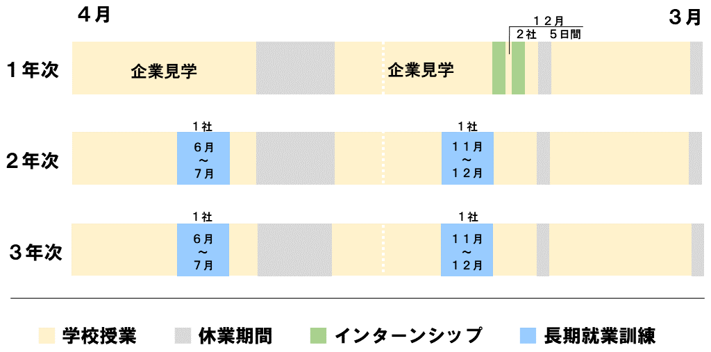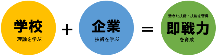 ”デュアル”とは2つという意味です。デュアルシステム科では、学校と企業が連携して、ものづくりの職業人を育成することを目的とした全く新しい学科です。企業で働くこと(企業実習)が、単位となります。長期間、企業で実習することで技術を習得するとともに、社会人として必要なマナーや資質が身に付きます。