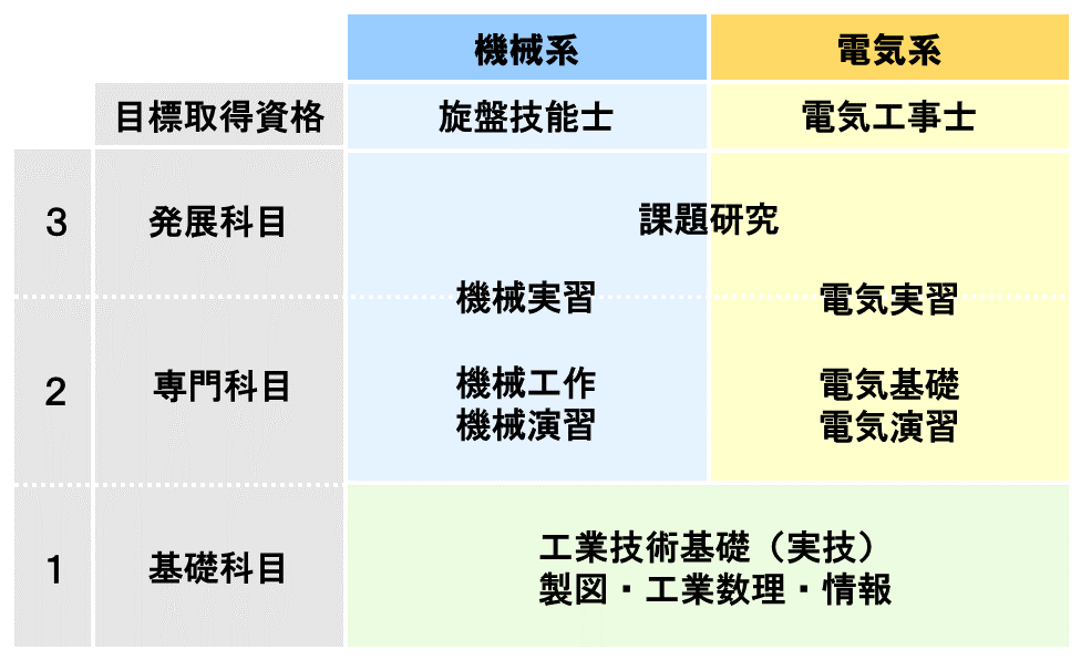 2年次より、「機械系・電気系」の2つのコースを選択できます。在籍中に、国家資格・検定の取得を目指します。