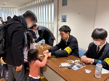 生徒たちの役割は、「六郷とんび凧の会」のブースにおける缶バッジ作りです。来場者のみなさんの缶バッジ作りをサポートし、子どもから大人まで300人以上の方々に楽しんでいただくことができました。このような地域イベントに参加することは、生徒たちにとっても貴重な経験となりました。機会があったらまた参加したいと意欲的な声もありました。