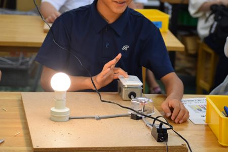 その後は、エレベーターボタンの分解組立や、やすりがけ作業、スタッド作業などの体験をしてもらいました。
