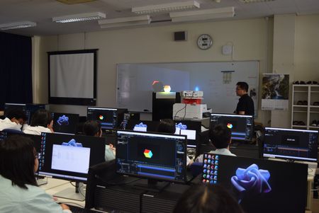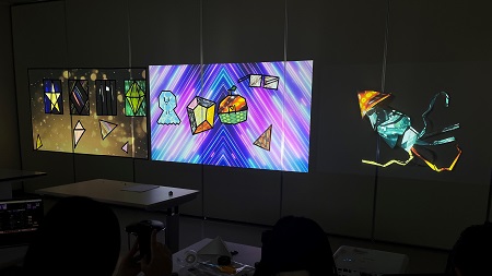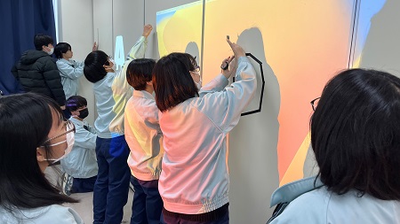 最後には、実際にプロジェクションマッピングのソフトを使用し、グループに分かれて生徒たちでプロジェクションマッピングに挑戦しました。お互いに協力しながら、それぞれのグループの個性ある作品を作ることができ、生徒たちも楽しみながら作品制作をしている様子がうかがえました。またプロジェクションマッピングの世界が身近に感じられたようで、今後の行事で挑戦したいという声が生徒たちから聞こえてきました。