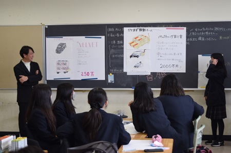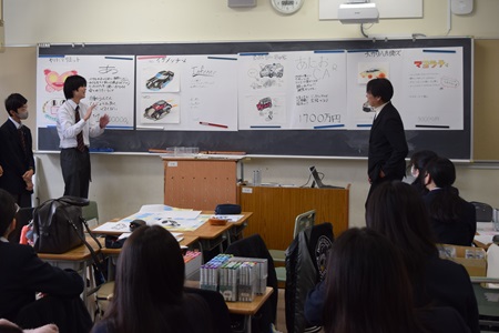 その後、「免許を取得したら初めて乗りたい車」をテーマに、グループでアイデアを出し合い、各自でデザインを作成。最後には、プレゼンテーションを行い、創造力あふれる作品が多数発表されました。